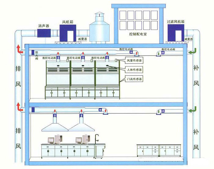实验室通风系统一般由通风设备、通风管道、消声器、风机、控制系统组成。